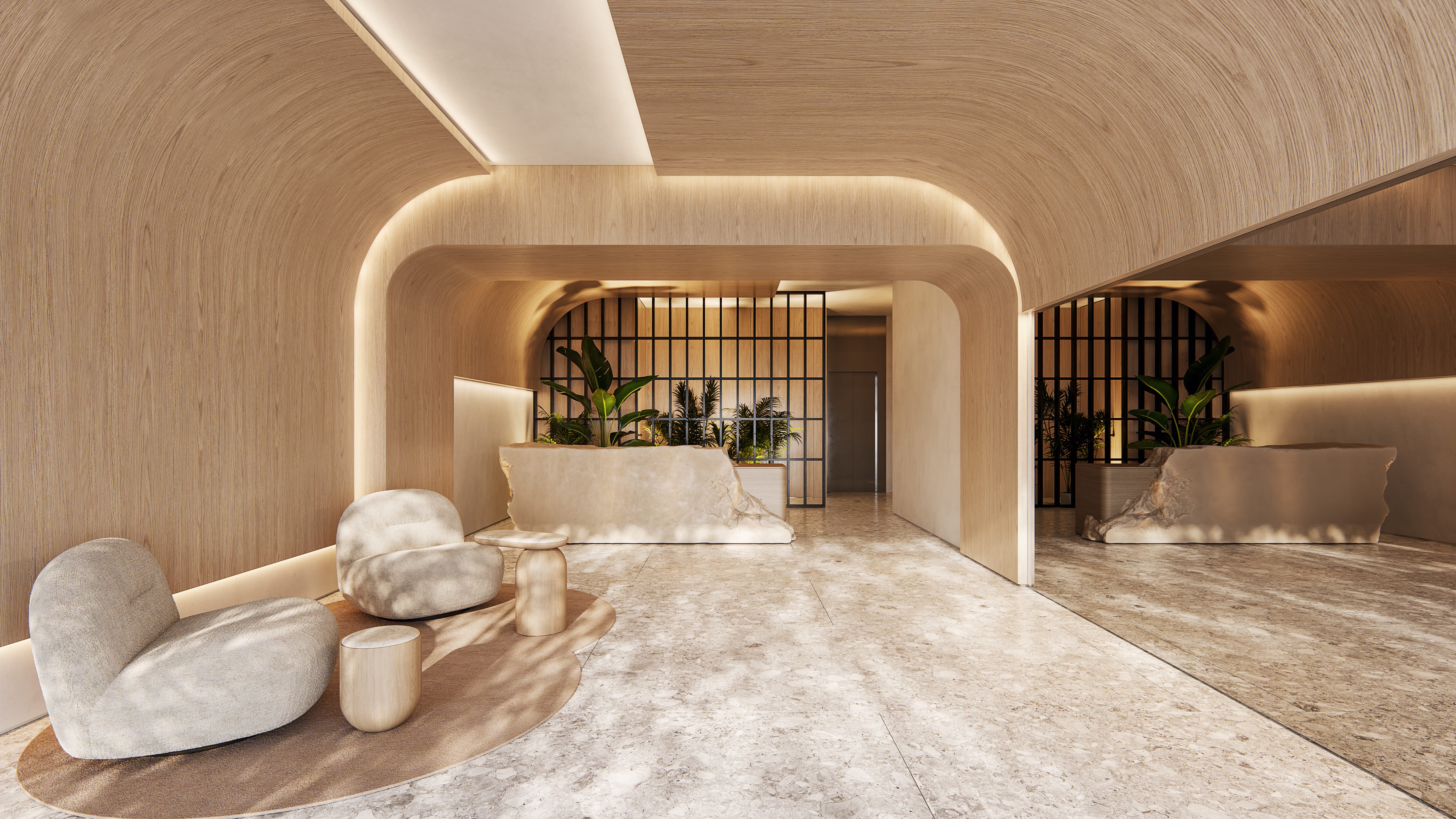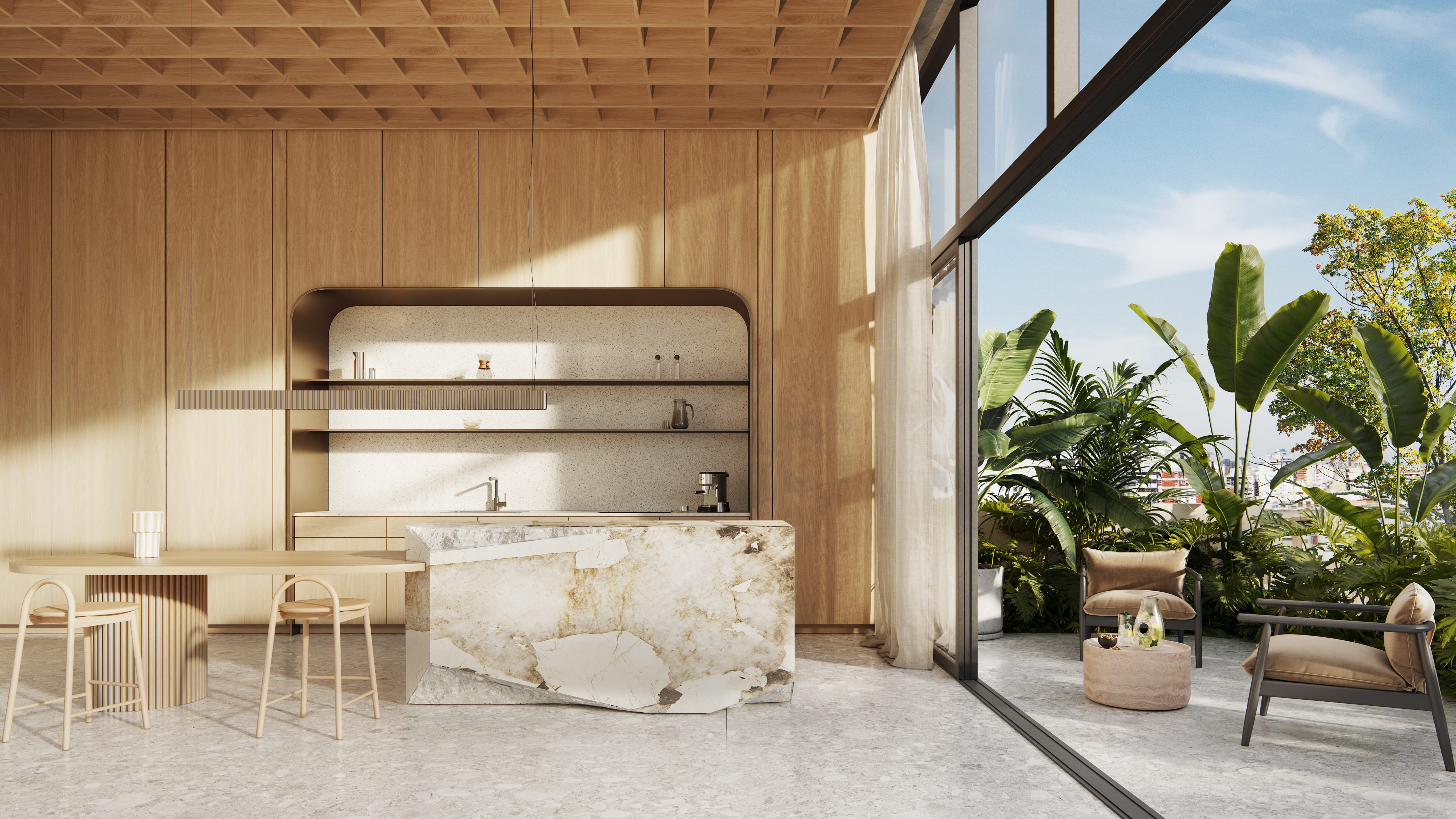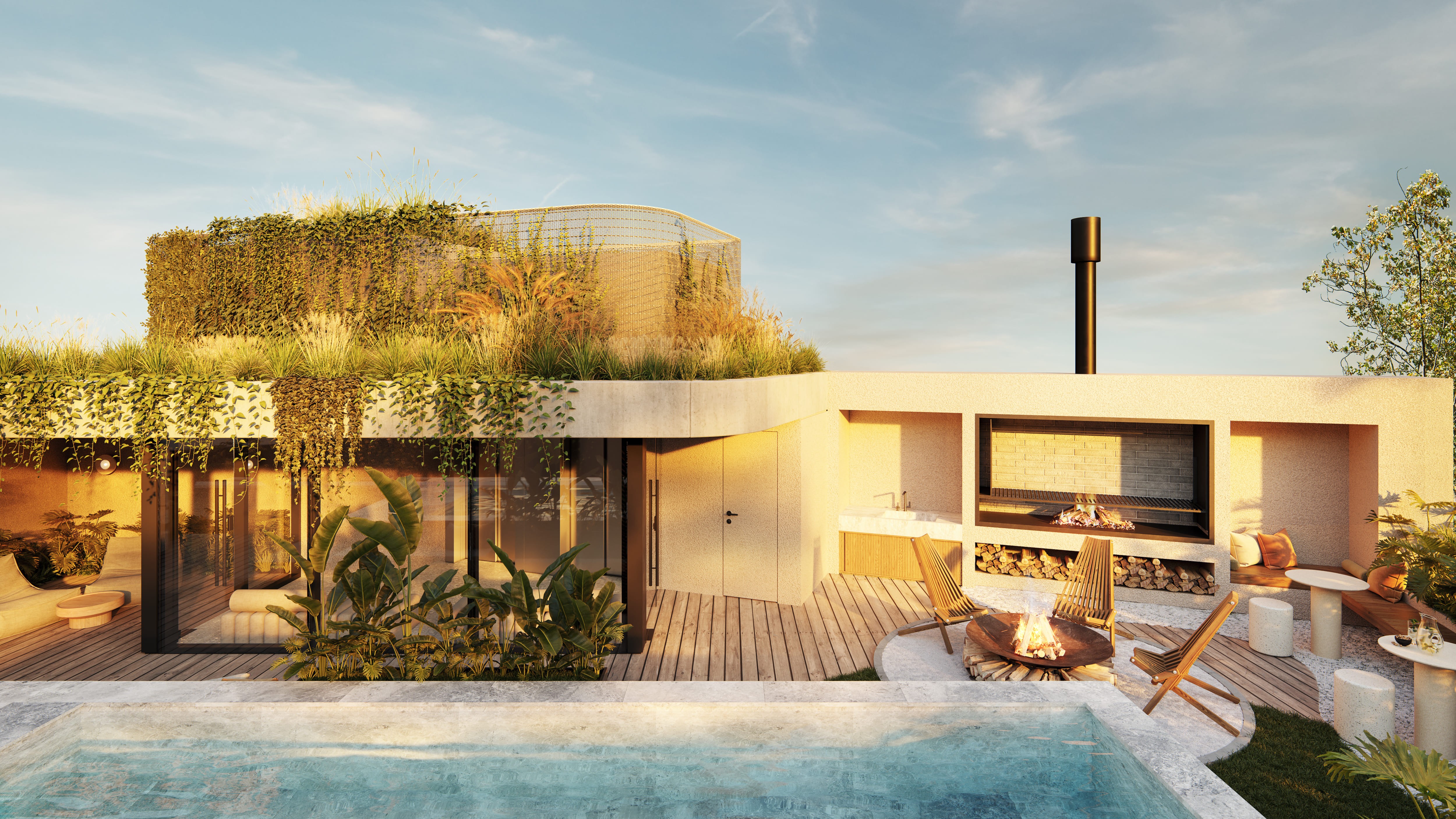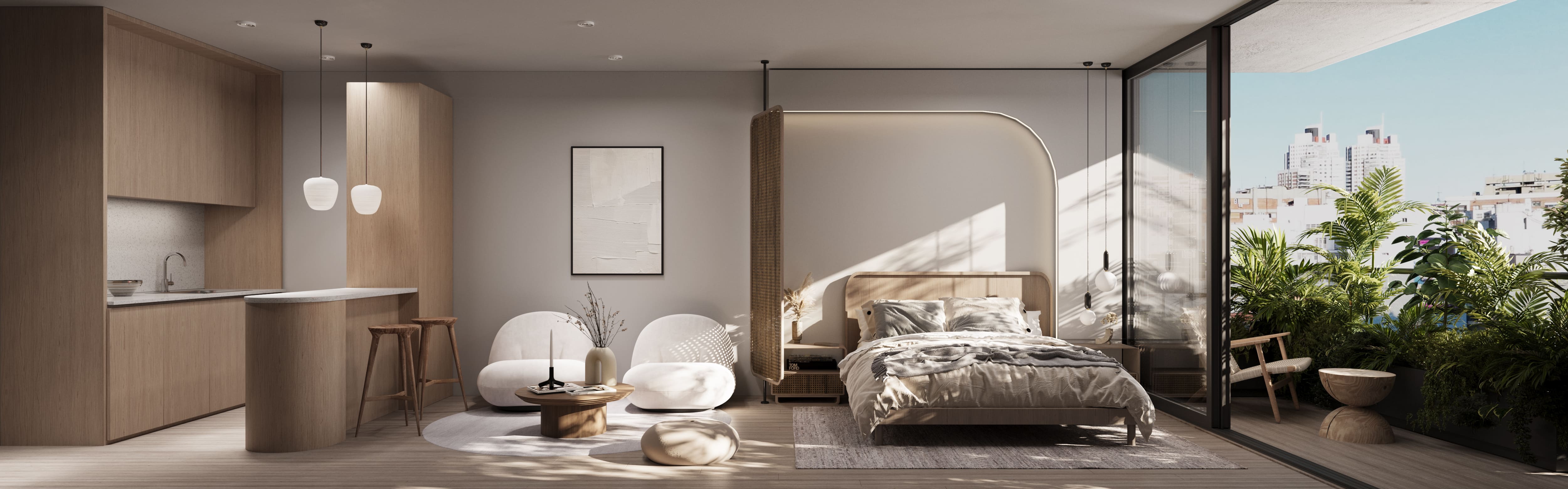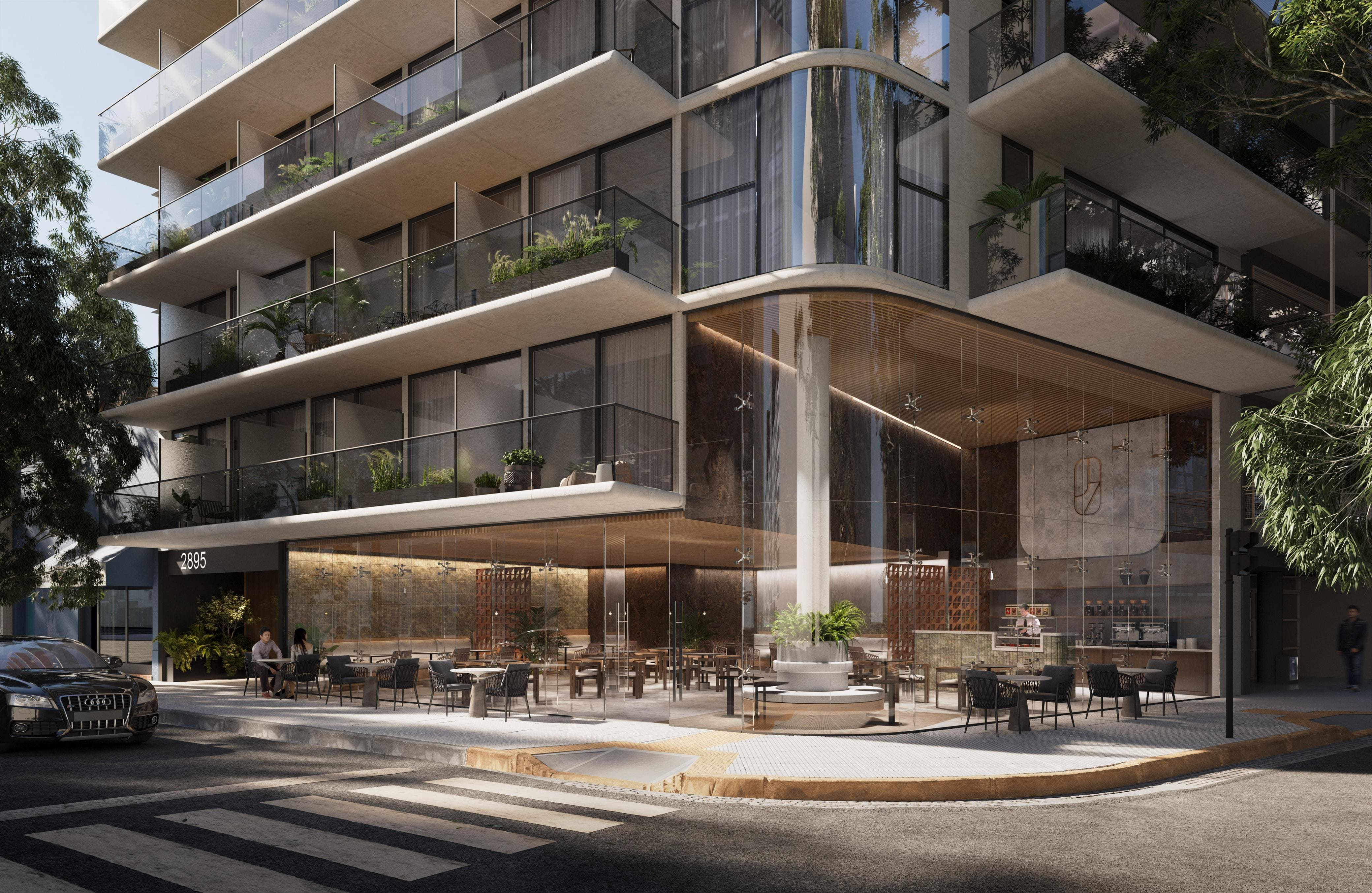 El diseño del edificio responde a la dinámica del barrio y la vida urbana. La planta se organiza en torno a un zócalo activo con un local gastronómico en doble altura que integra al proyecto con la calle, mientras los niveles superiores ofrecen unidades compactas y luminosas. La terraza con piscina infinita, espacios verdes y áreas de coworking prolonga la experiencia hacia el cielo, creando un recorrido vertical que equilibra intimidad y comunidad.