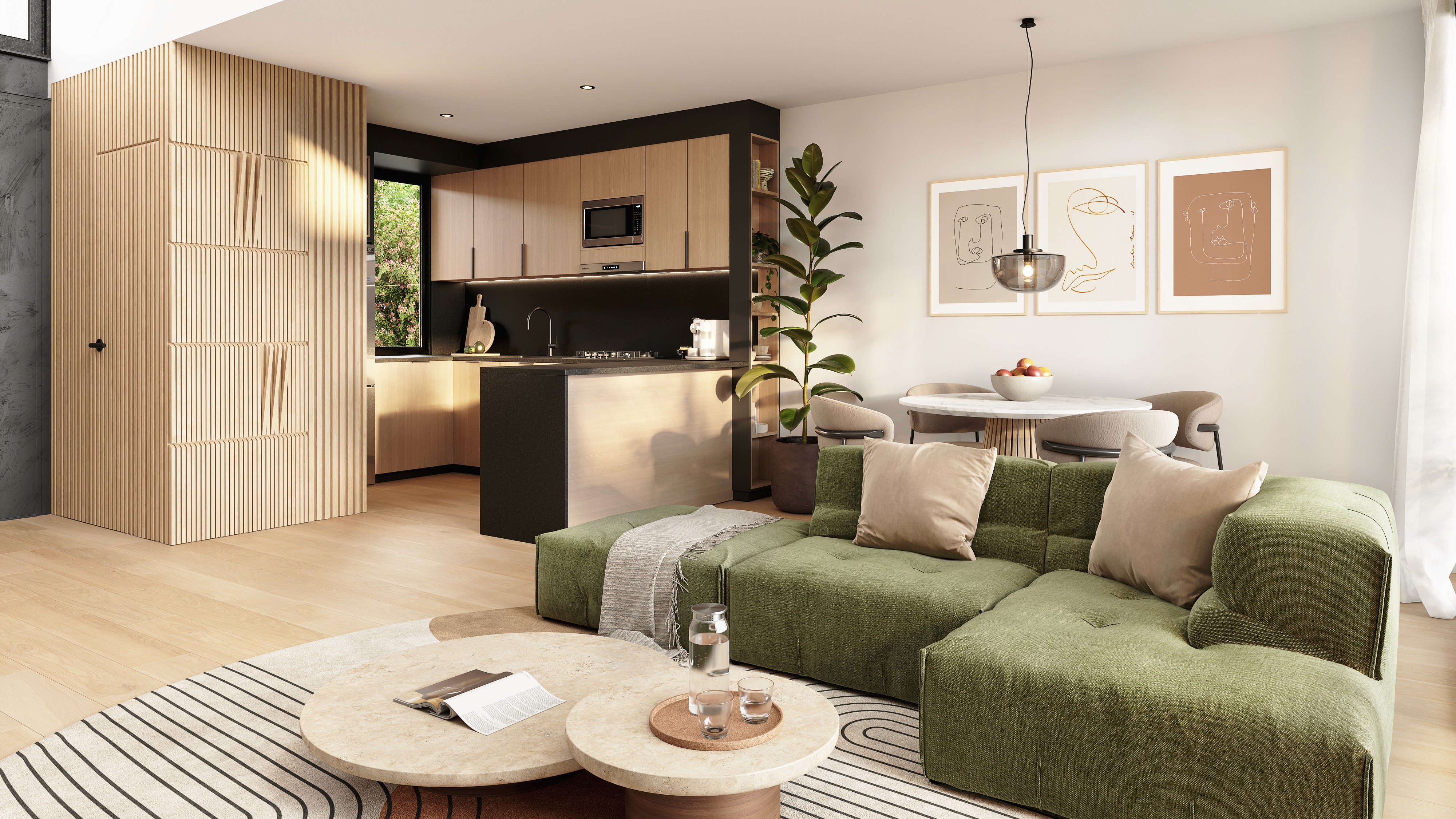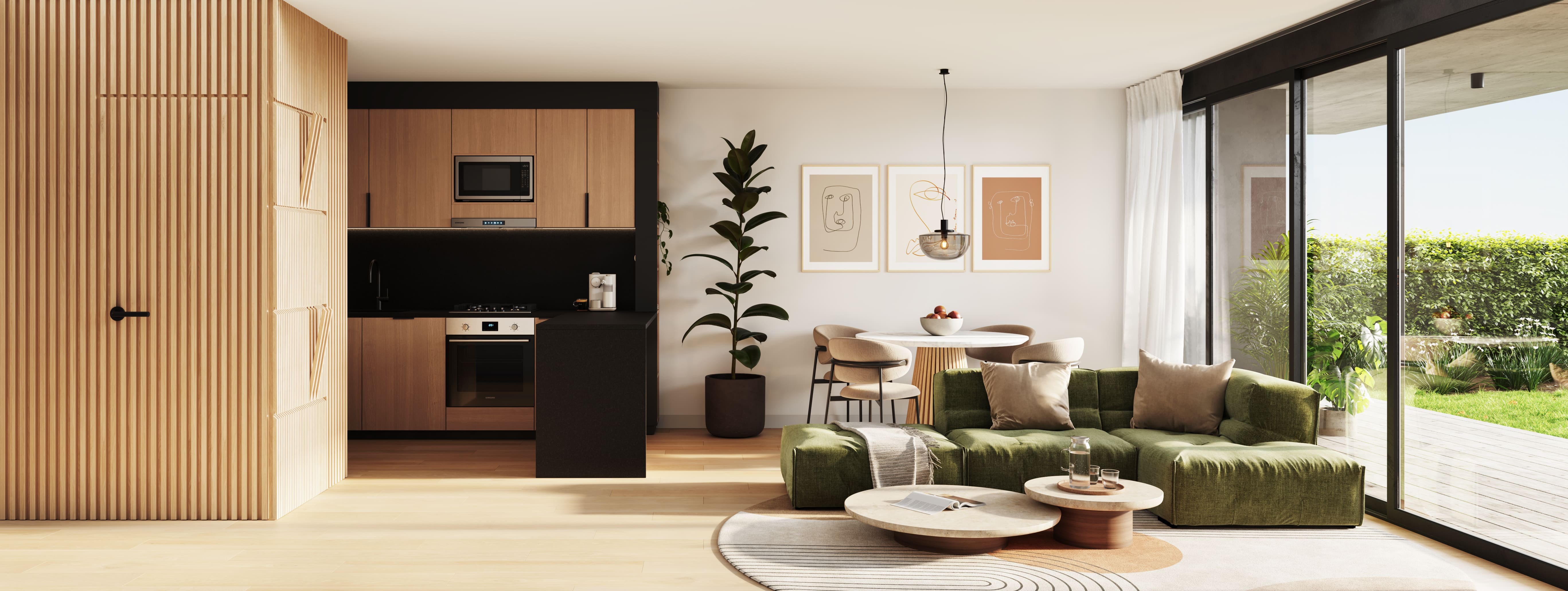 El proyecto se desarrolla sobre un terreno de 14 hectáreas, con una planificación que prioriza la vida comunitaria. Una gran plaza central organiza el barrio como punto de encuentro, rodeada de canchas, postas aeróbicas y espacios de descanso. La parquización con especies nativas preserva la biodiversidad y acompaña un paisaje pensado para cambiar con las estaciones, integrando arquitectura, naturaleza y vida diaria.