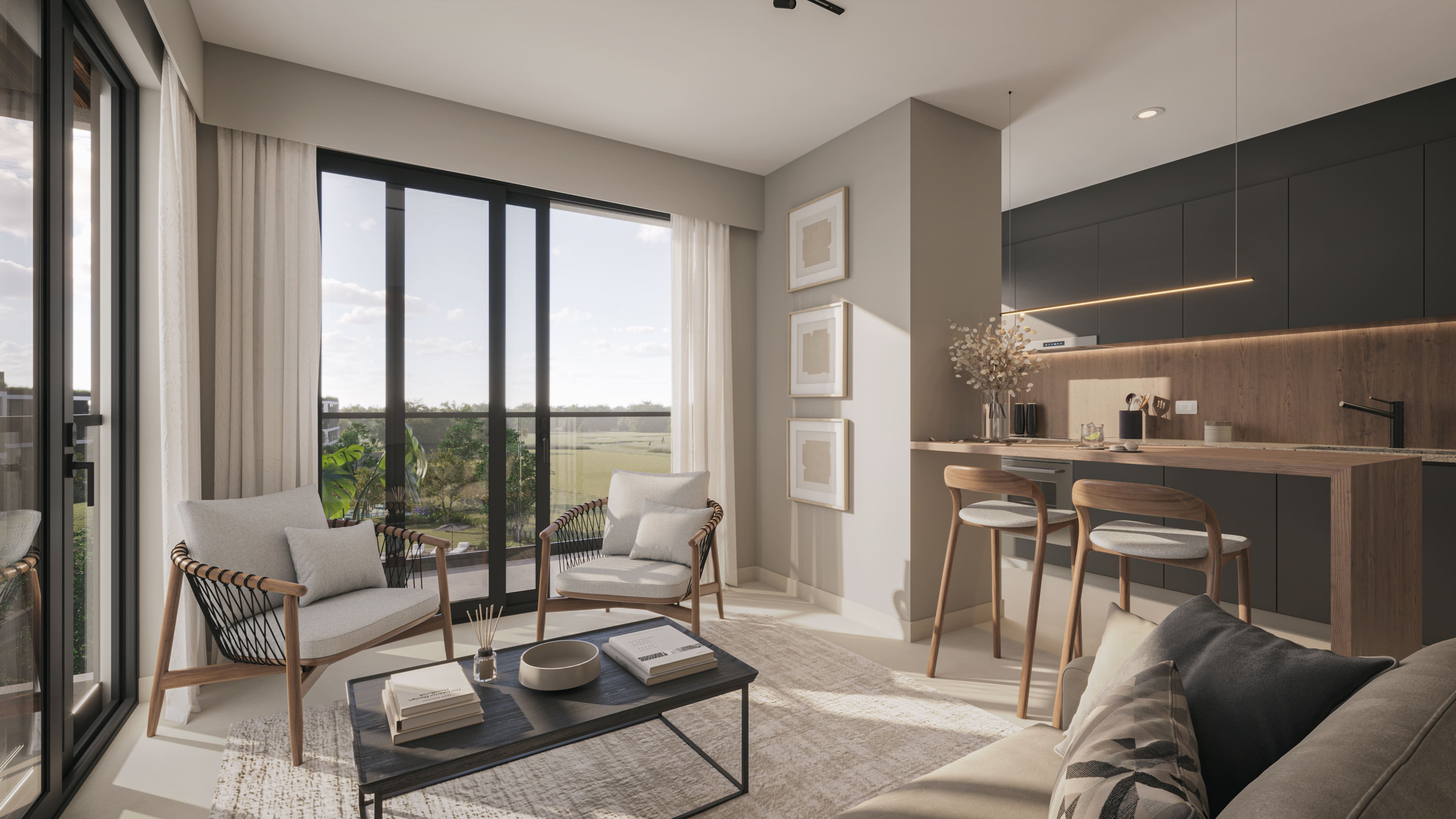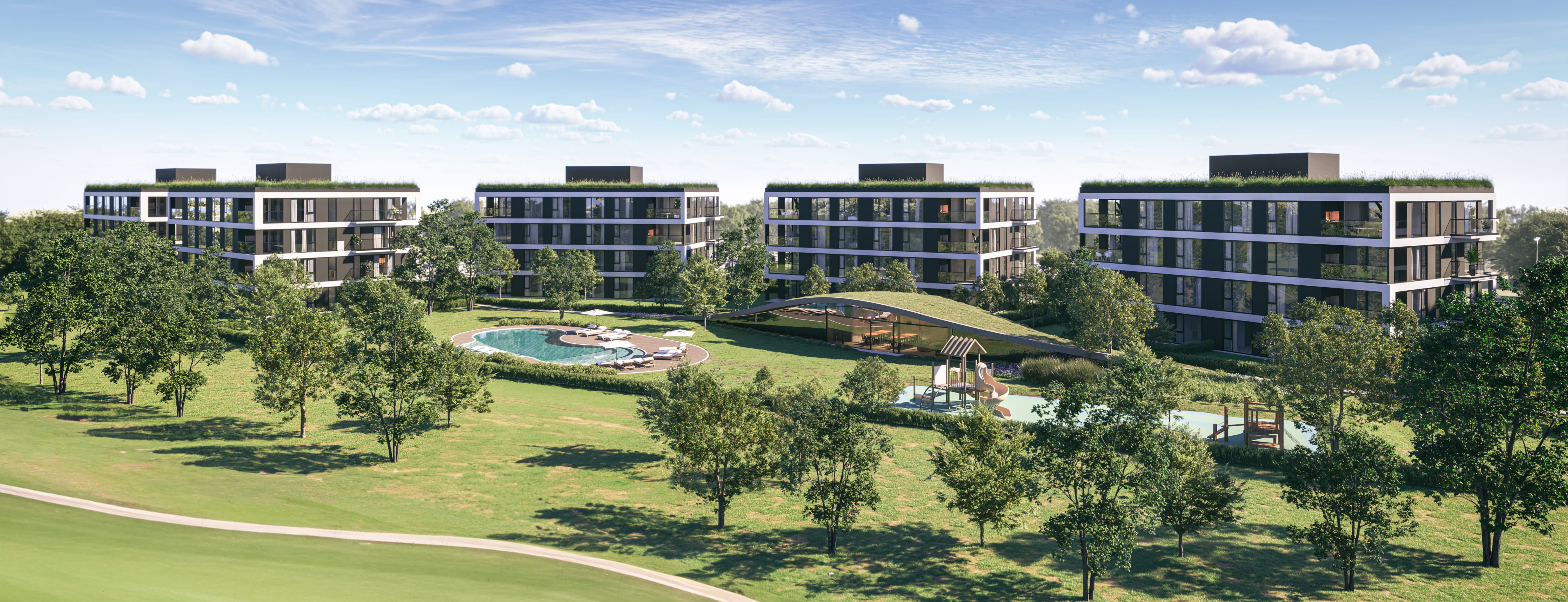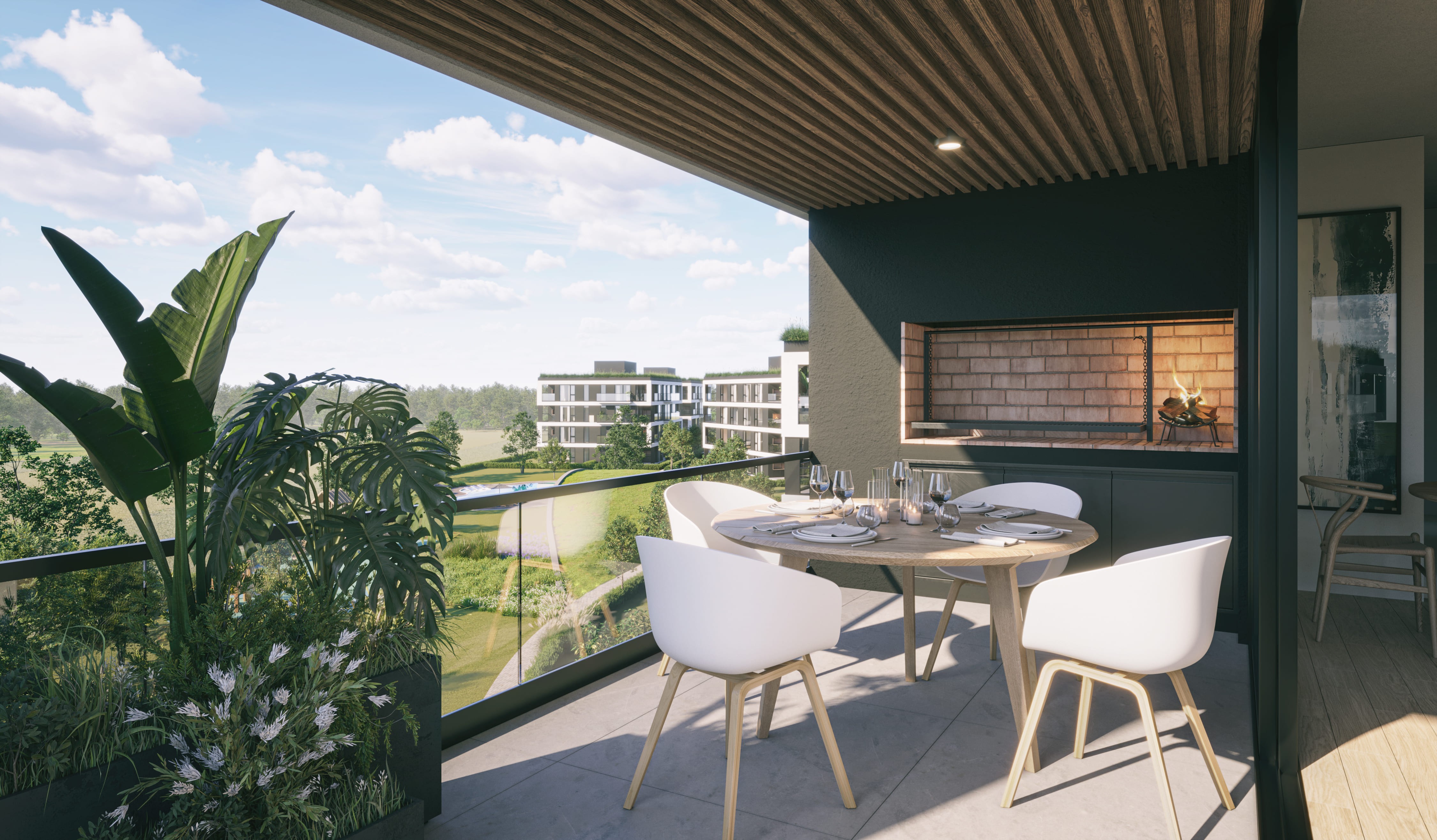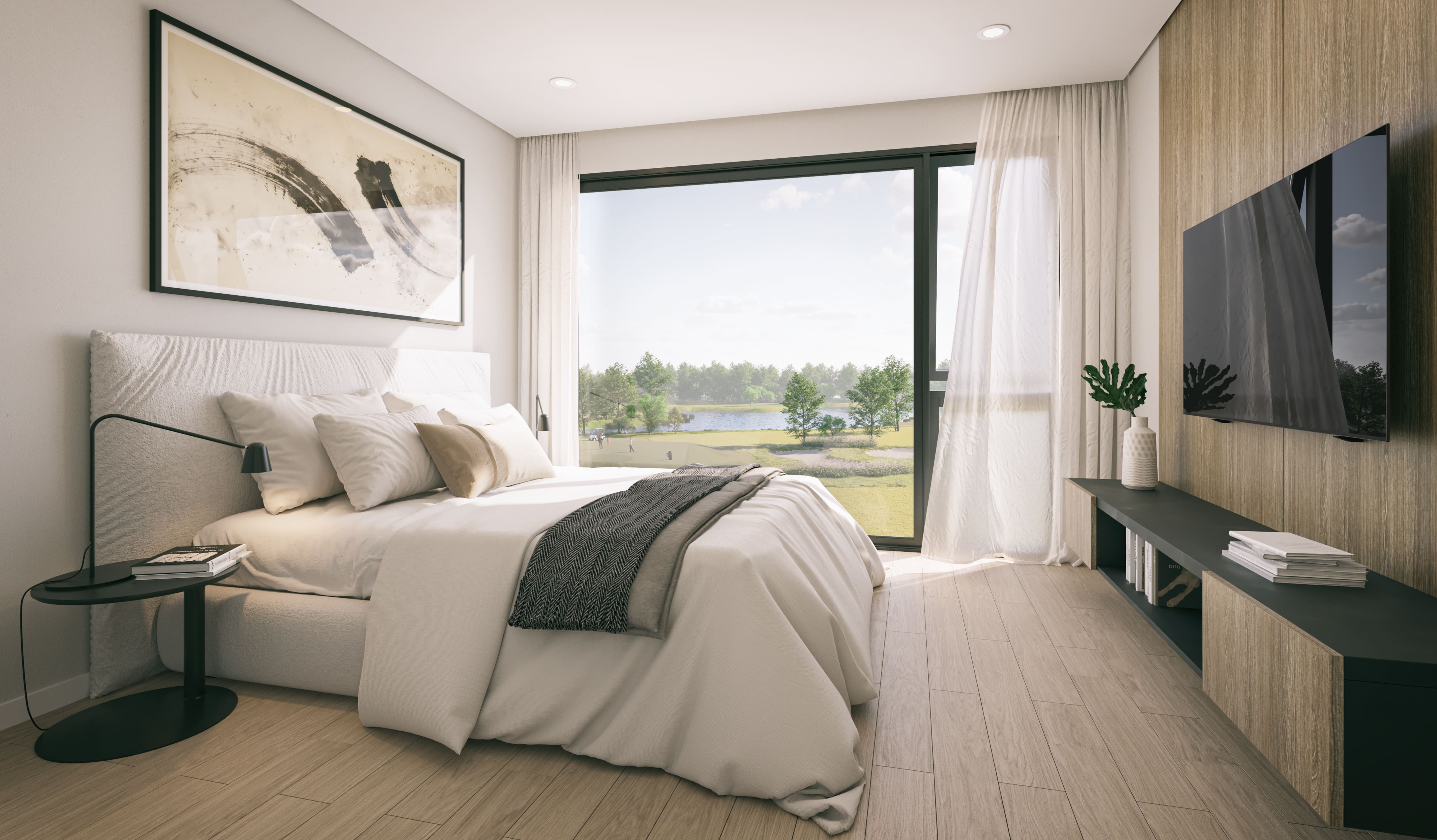 El proyecto se diseñó priorizando la orientación norte de los edificios para garantizar luz natural y visuales abiertas hacia el golf. Los espacios comunes se integran con jardines y terrazas, extendiendo la vida al aire libre. Cada detalle busca generar confort y una experiencia cotidiana ligada al paisaje y al ritmo del entorno.